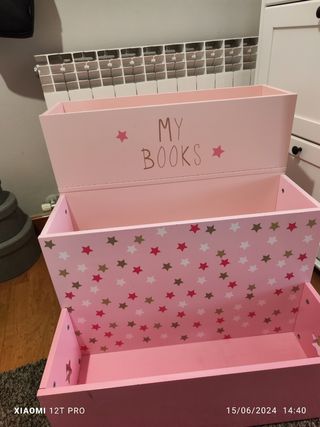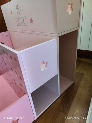 Librería de niña forma escalonada, entran muchos libros porque además tiene la parte de abajo que también se pueden guardar. Es de Vervaudet, nueva 70€.
