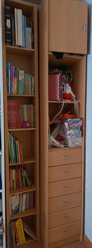 Conjunto de mobiliario que incluye una librería y un armario. Estructura principal de madera. - Detalles en plástico. Armario con cajonero baldas y altillo