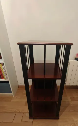 Práctica librería giratoria con un diseño moderno. - Estructura negro. - Estantes de madera en tono marrón. 45x45x108 Cms Venta por cambio de estilo y color de muebles de la habitación En muy buen estado de conservación.