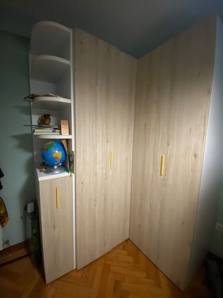 Armario de madera nuevo 2 años de uso. Muy buena calidad. Fabricación española. Pomos de aluminio. Zapatero, cajonera y dos secciones para colgar ropa. Librería.