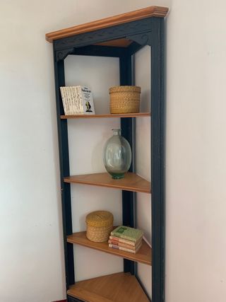 Estanteria libreria esquinera de madera craquelada en azul oscuro y cuatro baldas de madera natural. Tiene un pequeño golpe en un lateral que se puede reparar.