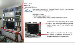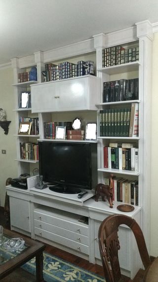 Libreria para el salón que incorpora una base articulada para la TV de hasta 50" y que permite orientarla hacia derecha e izquierda. El conjunto incorpora un mueble separado dedicado a guardar la cubertería. Dispone de luz. La librería la tenemos ya desmontada por un carpintero y embalada para transporte. Pero el armario del armario con cristalera para cubertería no se ha desmontado porque puede ser complicado el montaje posterior dado que dispone de luz, por lo que se ha embalado y guardado de píe. El precio no incluye transporte. Una de las imágenes incorpora las medidas del mueble y en la ficha de Wpop es la suma de los 2 mu