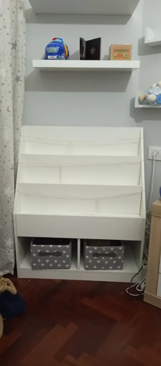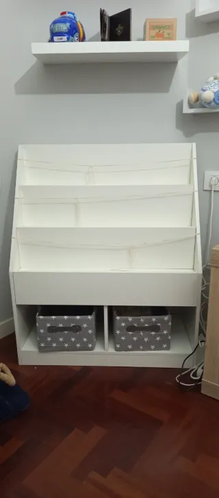 2 camas de 1.05(estructuras, colchones no incluidos) Escritorio 2m Librería 1.65×49 Mesilla 42×58 Estante blanco 1m×0.33 Estantería 1.03×0.33