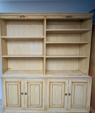 Alacena estantería en madera, restaurada y pintada en azules. Dos piezas que encajan.