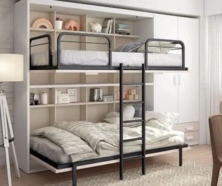 Litera abatible con dos camas, ideal para habitaciones infantiles o juveniles, pero admite colchones para adultos. - Diseño moderno y funcional. - Acabado en blanco y madera. - Armarios de gran capacidad. - Interiores vestidos con estanterías para libros o como mesillas de noche. - Estructura de acero resistente. - Incluye escalera y barandilla. Medidas: -Largo: 208 cm -Alto: 240 cm en total -Fondo: 55 cm (+75 cm con las camas desplegadas o +48 cm puerta armario abierta). -Tamaño colchones: hasta 195 cm x 92,5 cm -Distancia al suelo con cama inferior desplegada: 30 cm IMPRESCINDIBLE DESMONTAR EN LOCAL