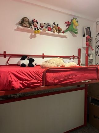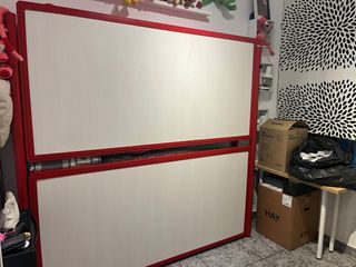 Litera abatible con escritorio integrado, buena calidad de material. - Estructura principal en blanco y panel frontal en rojo. - Escalera metálica para acceso a la cama superior. - Escritorio amplio bajo la cama. - Barandilla de seguridad en la cama superior. - Al bajar el escritorio sale la cama de 80,la de arriba es de 90. Regalo cajonera con ruedas. RECOGIDA Y DESMONTAJE A CARGO DEL COMPRADOR