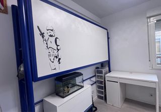 Litera abatible. Medidas de dos camas de 90. Sin colchones. Toda la estructura es blanca, tiene una cinta de pizarra blanca bajo la cama superior para poder escribir, se puede dejar o quitar. No envío
