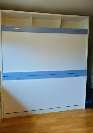 Litera abatible horizontal, Parchís, perfecta para espacio reducido, con dos camas de 90×190cm. Diseño en blanco y azul. En la parte alta tiene tres estantes bastante amplios. Tiene quitamiedos plegable y escaleras extraibles. Usada pero en perfecto estado. Calidad alta, madera y sistemas hidráulicos. Medidas: -2,09m de ancho x 2,38m de alto x 0,42m de fondo -Regalo 2 colchones Flex 90x190 -Hay que desmontarla, no incluye portes, de ahí su precio.