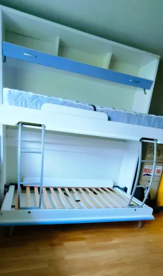 Litera abatible, perfecta para optimizar el espacio en tu hogar. Su diseño moderno se adapta a cualquier habitación, tanto en espacio como en diseño. 💡Características: - Estructura resistente. - Paneles de madera. - Sistema de amortiguadores hidráulicos para el cierre de las literas. - Contiene sistema de cierre de seguridad. - Colchones incluidos. - Patas metálicas plegables para optimizar espacio. - Escalera movible para quitarla o ponerla. Precio de compra 1300€ Precio negociable, cualquier duda 📨 Se recoge en Castelldefels.