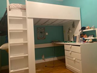 Litera con cama arriba y escritorio abajo, armario integrado. Tiene cuatro cajones amplios y 4 baldas para almacenaje. Marca Ikea de hace unos años, se vende porque ya no se utiliza. Tiene los desperfectos propios del uso, pero se encuentra en buen estado. Se adjuntan fotos de los desperfectos (pequeños golpes y alguna mancha que no afecta al funcionamiento). El escritorio tiene un agujero para cables. La cama es de 2×0,92 aprox. (un cuerpo). El armarito es 1,40x60. En su día se compró por 500 €, se vende por 300 €. ¡Se aceptan ofertas! - Estructura de madera. - Acabado en blanco.