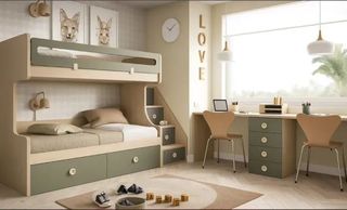 Litera con un diseño moderno y funcional, perfecta para habitaciones infantiles. Combina colores vibrantes con acabados limpios. - Estructura de madera robusta. - Barandillas de seguridad en la cama superior. - Escalera lateral de acceso fácil. - Cajones inferiores para almacenamiento adicional. - mesa de escritorio haciendo juego como nuevo