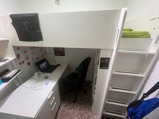 Mueble multifunción tipo litera con escritorio abatible, ideal para habitaciones juveniles o espacios pequeños. La cama es de 90 cm, situada en la parte superior, con escalera metálica resistente. En la parte inferior tiene un escritorio amplio y una cajonera lateral con varios cajones, perfecta para estudiar o teletrabajar. Estructura sólida y en buen estado (no se ha usado nunca de manera regular puesto que se trata de una habitación de invitados). Incluye el colchón. Importante: El mueble se vende tal cual está y debe venir a recogerse (no hago envíos). Se recomienda venir con ayuda para desmontaje y transporte.
