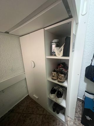 Composición de: Cama abatible Pequeño armario Estanterías (escritorio y mesita no incluidos en el precio) Medidas en la segunda foto. Transporte y montaje opcional, en Barcelona por 115€ Financiamos hasta 12 meses sin intereses.
