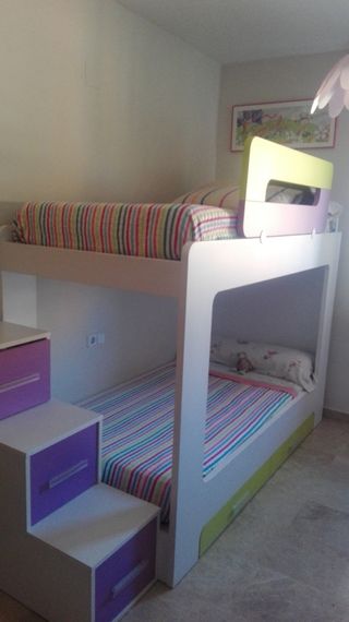 Juego dormitorio tipo nido, juvenil/infantil.Litera. Compuesto por 2 camas individuales, tamaño 90x190 (no incluye colchones). Cama superior con base de madera robusta. Cama interna con ruedas y somier de madera y metal. Posee un escritorio con ruedas que se guarda debajo de la cama (reparado, de allí el precio, la última foto muestra el arreglo, se puede sustituir por bases de metal si se quiere o reforzar y utilizar la mesa). Tiene menos de 3 años. Se vende montada, el comprador tendrá que desmontarla (ayudo) y transportarla. Recoger en Valencia, ayudamos a desmontar de ser necesario. Hay ascensor, pero hay que bajar las 2 lá