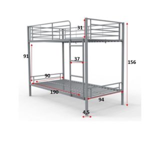 Litera de metal en color gris, ideal para optimizar el espacio. - Medidas: 190 cm de largo x 90 cm de ancho. - Altura total: 156 cm. - Altura entre camas: 91 cm. - Profundidad de la barandilla superior: 31 cm. - Ancho de la escalera: 37 cm. - Grosor de las patas: 4,5 cm.