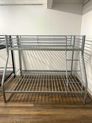 Litera de metal en color negro. Está desmontada, se ofrece transporte precio aparte según zona. Está en ALCOBENDAS - Medidas totales: 200 cm de largo x 145 cm de ancho x 160 cm de alto. - Altura de la litera inferior: 91 cm. - Altura de la litera superior: 160 cm. - Ancho de la cama: 96 cm. - Largo de la cama: 155 cm. - Altura del colchón inferior: 31 cm. - Altura del colchón superior: 26.5 cm. - Profundidad de la barandilla: 32 cm. - Altura total de la barandilla: 128 cm.