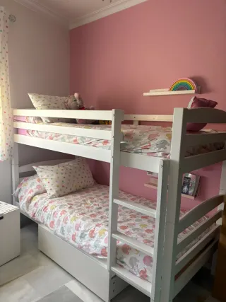Literas de madera en color blanco, también se pueden poner como camas individuales. Ideales para habitaciones infantiles o juveniles. Cuentan con un práctico cajón con ruedas. Las camas se pueden poner también por separado. Incluye: - Los dos colchones, el de arriba está sin estrenar porque la cama de arriba está sin estrenar. - Estructura robusta de madera. - Cajón inferior con ruedas para fácil acceso. - Diseño moderno y funcional. Todo por 250€