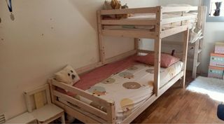 Litera de madera maciza, color natural, ideal para habitaciones infantiles. Comprada en Conforama en 2016. Usada como litera entre 2016-2020, y solo la cama de abajo entre 2021-2025. Se ofrece desmontada. Si una vez montada, no le convence, se acepta devolución