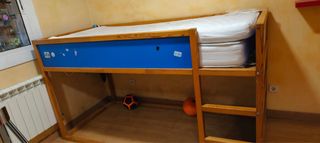 Litera de madera con detalles en azul, ideal para habitaciones infantiles o juveniles. Diseñada por Ikea, combina funcionalidad y estilo. - Estructura principal de madera. - Paneles laterales de color azul y blanco - Incluye colchónes. -Se puede montar la escalera de dos maneras diferente. (Ver fotos) - Diseño funcional y seguro. Medidas: Ancho 209cm Altura 115 cm Profundidad 98 cm Colchones con sólo 3 meses de uso. (En perfectas condiciones) Precio: Estructura 80€ Colchones 30€ cada uno Total 140€ 80+30+30