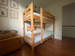 Litera de madera con cama de matrimonio abajo y cama individual arriba. Incluye escalera lateral. - Estructura robusta de madera. - Posibilidad de hacerse 2 camas independientes (una de 1,35 y otra de 0,90). * Se entrega desmontada con las instrucciones de montaje. Precio original: 459€ Año de compra: 2024