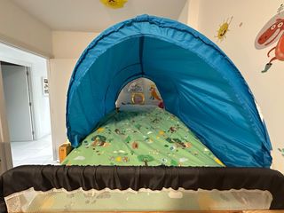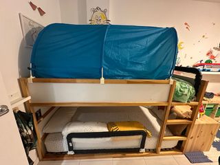 Litera reversible con dos somieres incluidos. Ideal para optimizar el espacio en habitaciones infantiles. Con divertida cobertura tienda de campaña para jugar y leer. Se vende con barrera anticaída. Se pueden poner dos colchones. Medidas en la ultima foto. Se vende por traslado. - Estructura de madera resistente. - Incluye dos somieres. - Diseño reversible.