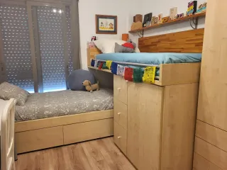 Mueble de dormitorio muy funcional y en buen estado, ideal para habitaciones juveniles o espacios pequeños. Consta de dos camas individuales abatibles integradas en una estructura de madera clara, con un frente abatible en color naranja que aporta un toque moderno y alegre. Incluye: • Dos camas individuales abatible (una superior y otra inferior) • Módulos superiores con puertas y estanterías • Escalera metálica integrada para acceder a la cama superior Diseño compacto que aprovecha muy bien el espacio, todo en un solo conjunto. Inclusión del Armario a negociar.
