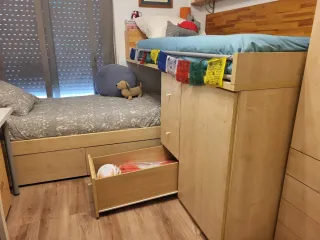 Cama litera de madera natural, ideal para habitaciones infantiles o juveniles. Su diseño sencillo y robusto la hace perfecta para el descanso y el juego. - Estructura de madera maciza. - Acabado en madera natural. - Incluye barreras de seguridad en la cama superior. - cama individual en parte superior y cama doble de 135 cm en parte inferior. Adjunto fotos de detalle donde se reforzó con otro tornillo. se ha usado 3 años, la primera foto es de cuando se compró. Recogida en Calle Gomis 46