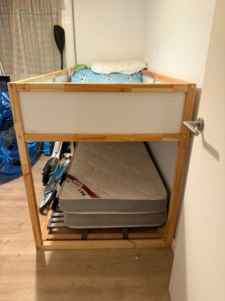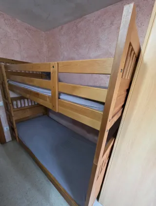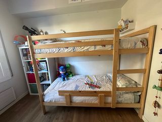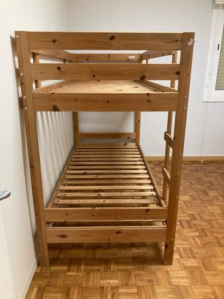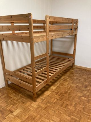 Litera doble de madera, ideal para optimizar el espacio en habitaciones. - Estructura robusta y segura. - Diseño clásico y funcional. - Ya no disponible en Ikea. - Recogida en persona, cama ya desmontada (hay que bajarla tres pisos sin ascensor). - Precio negociable.