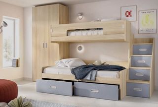Litera de matrimonio en la parte inferior y contenedores e individual en la parte superior, cama inferior de 135 x 190, módulo escalera de cajones litera 42,5 ancho. Necesita somier inferior (+80€). Composición completa con armario, escritorio, escalera y litera consultarnos. Medida de la litera: 203 x 169 alto x 147 fondo. Transporte y montaje opcional 150€ (hasta 15 km) Más ofertas en mueblesdetena.es WhatsApp 615570307