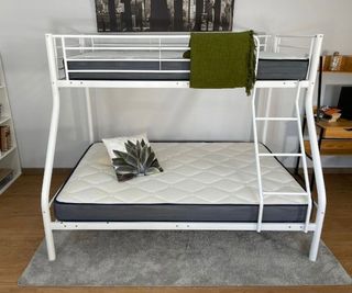Litera para cama de matrimonio de 135cm. Comprado en ikea a mi me fue muy bien ya que mi cuarto era pequeño y me ocupaba mucho una cama grande así que la litera fue la mejor opcion así puede poner el pupitre debajo con mi ordenador al lado una cómoda para la ropa y tenia puesto un puf para sentarme en el suelo... (Aparte)También vendo las estanteria blancas 3 estanterías por 20€ Si te quieres llevar todo seria 210€ (Litera,colchón y 3 estanterías) - Estructura de madera la cama tiene estas medidas Ancho: 152cm Largo: 208cm Alto desde la valla hasta el suelo 213cm - colchón de 135cm 🚫No hago envíos, venir a buscar con furgoneta!
