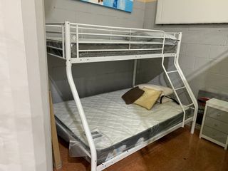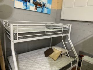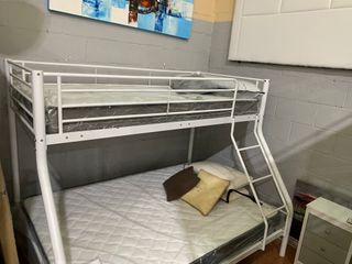 ☎️ 680*558*196 💶 Precios: 359 € con colchones incluidos 130 € sin colchones litera matrimonial cama doble nueva a estrenar, ideal para maximizar espacio sin renunciar a la comodidad. Diseño moderno y resistente,. La litera admite dos camas de 135 cm, ofreciendo una solución práctica tanto para familias como para alquileres vacacionales. 🔹 Estructura metálica blanca, robusta y estable 🔹 Escalera integrada para un acceso cómodo y seguro 🔹 Barandilla superior para mayor seguridad 🔹 Estilo minimalista que encaja en cualquier decoración 📏 Medidas: Alto: 160 cm Ancho: 135 cm Largo: 190 cm