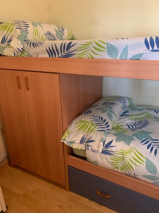 Litera con capacidad para tres personas, ideal para optimizar el espacio. Con un armario de gran capacidad. La cama nido se puede extraer del todo y trasladar a otra habitación, lleva ruedas y patas plegables para alzar a la altura de una cama normal. Aunque normalmente he utilizado esa tercera cama como cajón para guardar ropa de cama. Es realmente práctico. - Estructura principal de madera. - Incluye 2 colchones ( uno vendido)y ropa de cama ( han tenido uso per bien conservadas). - Ropa de cama : 4 fundas nórdicas con sus respectivas almohadas, sábanas y 2 rellenos nórdicos . Desmontaje y recogida a cargo del comprador.