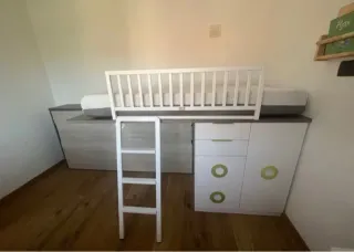 Se vende litera plegable de madera y metal, ideal para habitaciones con poco espacio. Incluye dos colchones. • Medidas: Los colchones miden 85x200cm . • Estructura blanca con vinilos decorativos. • Escalera de metal desmontable, balda superior para almacenamiento. Estado: • En buen estado general y muy limpia. • Pequeños signos de uso: pintura algo desgastada en escalera y barandilla, pero todo funciona perfectamente.