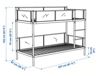 Estructura de litera de metal, ideal para optimizar el espacio. Diseñada por Ikea. - Construcción robusta y duradera. - Diseño moderno y funcional. - Incluye escalera de acceso a la cama superior. - Barreras de seguridad en la cama superior.