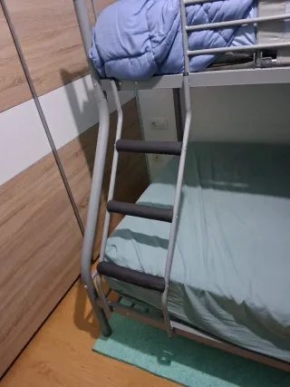 Litera metálica con cama de 90 cm en la parte superior y cama de 135 cm en la parte inferior. - Estructura robusta de metal. -actualmente montada, se vende desmontada. Tiene 2 meses, se vende por mudanza de piso. -incluye laminas acusticas para el suelo valoradas en 15 euros cada una.
