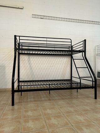 Estructura de litera metálica con un diseño moderno. - Fabricada con tubos metálicos resistentes. - Acabado en color negro. Para colchones de las siguientes medidas: litera inferior 140x190 cm y litera superior de 90x190 cm. Se vende la estructura. Estamos ubicados en la zona del Grau de Valencia