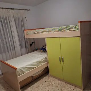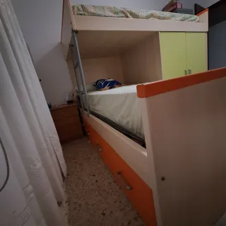 Litera individual con un diseño práctico que incluye escaleras para facilitar el acceso. - Estructura metálica robusta. - Panel lateral de tela. - Escaleras de acceso. *No incluye el escritorio La imagen 6 muestra como es sin el ángulo que me permite mi habitación, y la 1 una posibilidad de organización. Esas fotos son del producto, no mias. Medidas: Totales: largo de 2'7 metros, ancho (incluyendo el ángulo de la escalera) 136, de alto 187 Ancho de cama: 90cm Panel de tela: 36cm Importante: Tendréis que venir a recogerla y desmontarla. Defectos: algún que otro signo de desgaste. Fotos al final. Bastante bien en general.