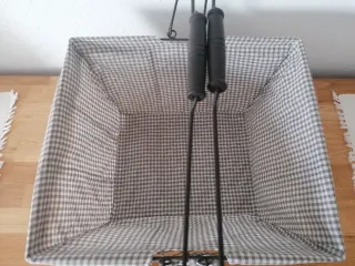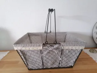 Cesta decorativa con un diseño encantador, tipo rústico, para ropa, plantas, revistas, etc. o decoración. - Estructura de metal. - Forro interior de tela con estampado de cuadros, a medida. - Medidas en las fotos: 40x36x20cm. Fondo de 24x29cm. Ligera, peso 700g. - Adorno de encaje en el borde superior con lacito en amdos lados. - Asa doble para facilitar su transporte. Cistella metàl·lica amb forro de tela de quadres, a mida, amb llacets laterals. Possibilitat de fer entregues en mà a Llagostera, Sils, Caldes Malavella, Vidreres i Sta Coloma de Farners.
