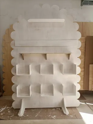 Panel expositor con diseño de nubes y estanterías. - Estructura de madera. - Color blanco y beige. - Múltiples compartimentos para exhibición.