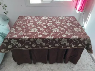 Mesa camilla con un bonito estampado flora, reversible. Patas barnizadas y tarima pintada. - Diseño con falda - Tejido resistente