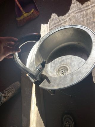Fregadero de metal con grifo incluido. Listo para instalar. - Diseño redondo. - Acabado plateado y negro.