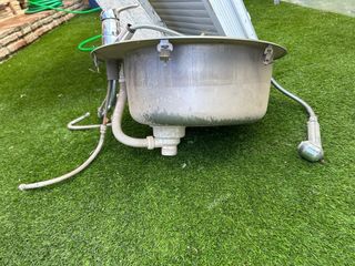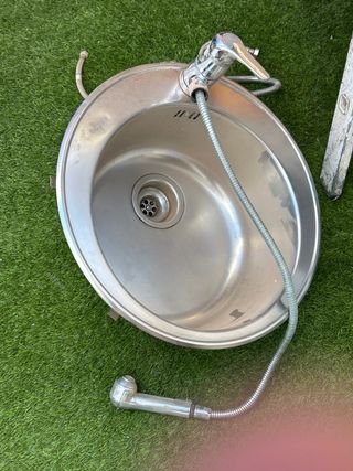 Fregadero de metal con grifo y ducha extraíble. - Diseño redondo. - Incluye desagüe. - Grifería cromada.