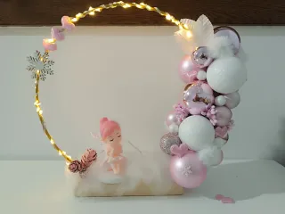 Precioso aro decorativo para Navidad con un diseño de hada y adornos. - Adornado con esferas y corazones. - Incorpora luces cálidas para un ambiente acogedor. - Figura de hada en tono rosa. - Detalles de copos de nieve y piñas.