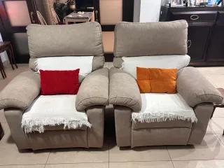 Se venden dos sillones cómodos y elegantes. - Tapicería de tela. - Cojines decorativos incluidos (uno rojo y uno naranja). - Diseño moderno y confortable.