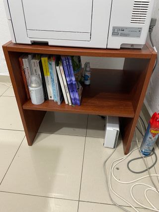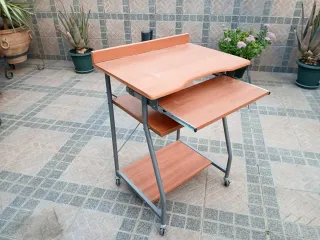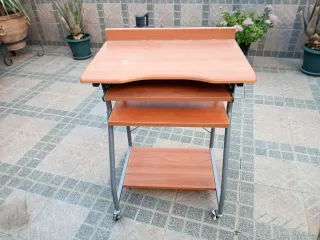 Mesa auxiliar para ordenador con un diseño práctico y funcional. - Superficie principal de madera. - Estructura de metal resistente. - Dos estantes adicionales para almacenamiento. - Ruedas para facilitar su movilidad.