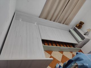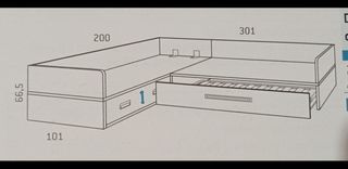 Estructura de cama en forma de L, con un diseño moderno y funcional. - Acabado en tonos beige y blanco. - Fabricada con materiales de calidad.