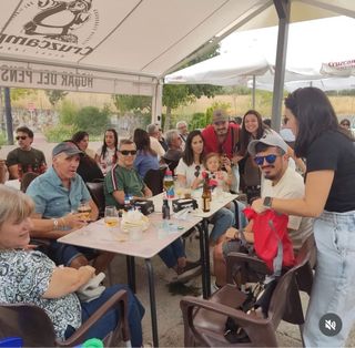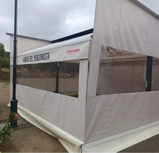 Pérgola de exterior diseñada para hostelería, con un cerramiento que ofrece protección adicional. - Estructura metálica. - Cubierta de plástico.