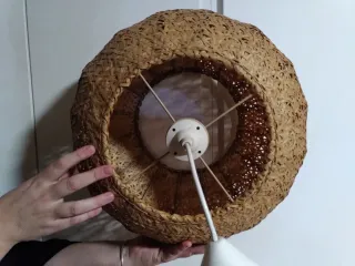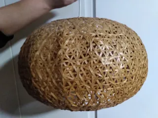 Lámpara colgante con un diseño artesanal y orgánico. Su tejido intrincado crea un ambiente cálido y acogedor. - Elaborada con tiras de bambú entrelazadas. - Tonos naturales que combinan fácilmente. Incluye un aplique blanco.