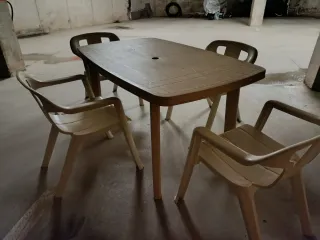 Conjunto de mesa y cuatro sillas de plástico duro, ideal para exteriores. - Mesa rectangular con centro hueco para sombrilla. - Sillas con diseño ergonómico y brazos.