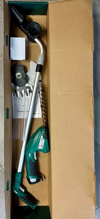 Cizalla eléctrica para hierbas y arbustos, ideal para el cuidado de tu jardín. Funciona con batería de litio de 7.2V. - Incluye cuchilla para cortar hierba y arbustos. - Dispositivo telescópico continuo. - Ancho de corte de la cizalla: 90 mm. - Longitud de corte de las tijeras de arbustos: 170 mm.